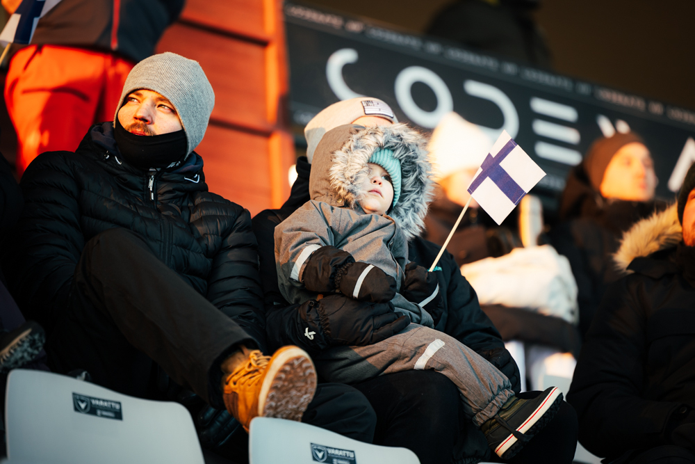 Suomen liput liehuivat Oulussa Raatin stadionin katsomossa itsenäisyyspäivän valtakunnallisen paraatin kunniaksi, eikä pakkanen hyydyttänyt yleisön hymyä paraatijoukkojen ohimarssiessa.