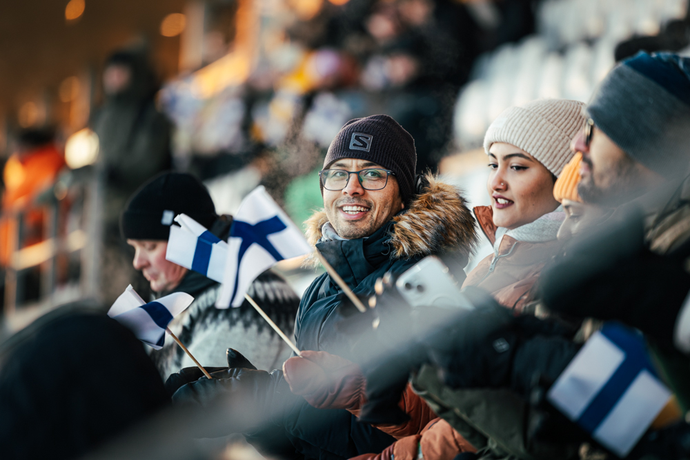 Yleisö otti paraatijoukot vastaan Suomen liput liehuen. Kuva: Eeli Gröhn
