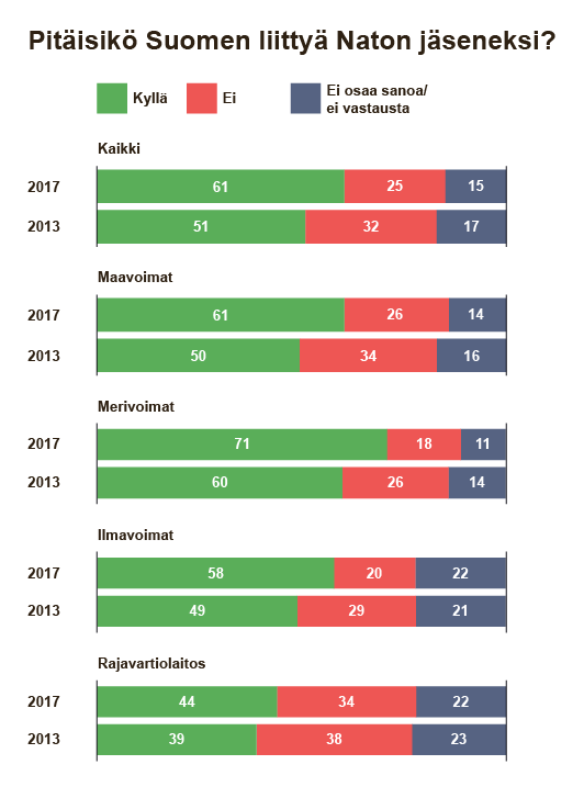 Puolustushaaroittain tarkasteltuna eroja on jonkin verran. Merivoimissa kannatus on suurinta, sillä peräti 71 prosenttia merivoimien upseereista on Natoon liittymisen kannalla. Sipilän mukaan merivoimien kansainvälisyys on pääsyynä korkeaan Nato-myönteisyyteen.