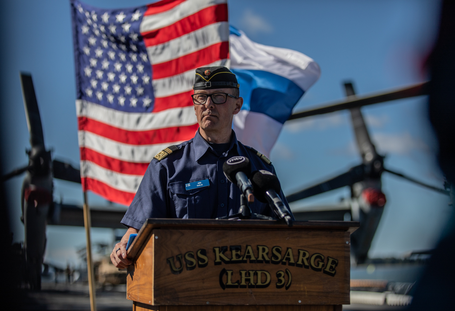 Yhdysvaltain laivaston maihinnousutukialus USS Kearsargen henkilökunta esitteli aluksen operointikykyjä suomalaisille ja kehui kilpaa Suomen merivoimien suorituskykyä. Alus osallistuu Suomessa tällä viikolla alkavaan Merivoimien sotaharjoitukseen.