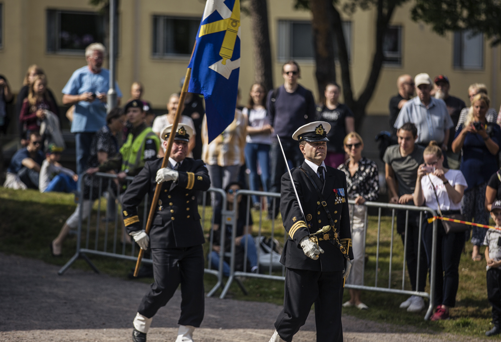 Eteen viedyt aseet kunnioittivat lippua, kunnes tuli aika olalleviennin. Tämän jälkeen valatilaisuuden ja sitä seuranneen ohimarssin vastaanottanut Rannikkoprikaatin komentaja, kommodori Vesa Tuominen tarkasti valajoukot.