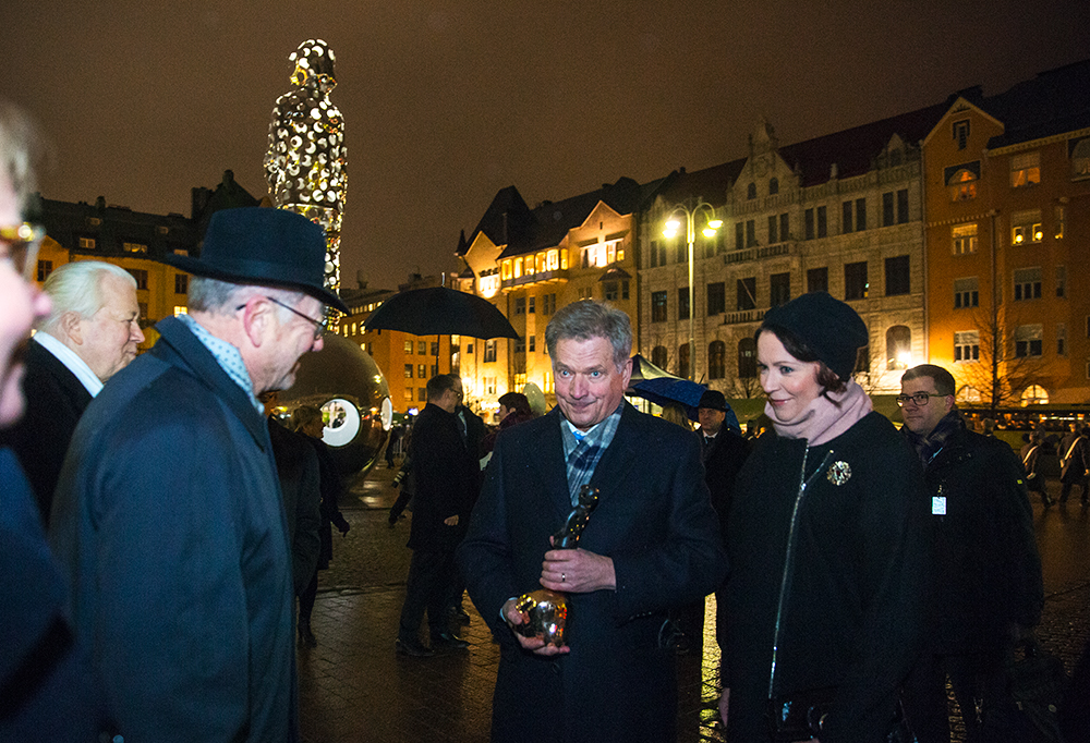Tasavallan presidentti ja rouva Jenni Haukio saivat patsaan pienoismallin.