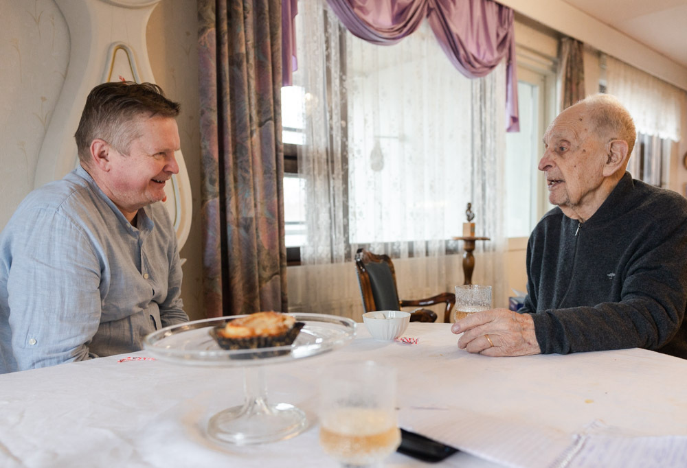 Tyylikkään elegantisti sisustetun ruokailutilan pöydälle on katettu kahvikupit, munariisipasteijat ja paakelsit valmiiksi. Nurmijärveläinen kerrostaloasunto on ollut 100-vuotiaan jatkosodan veteraanin, Mauno Tenhovirran, koti jo lähes neljänkymmenen vuoden ajan.