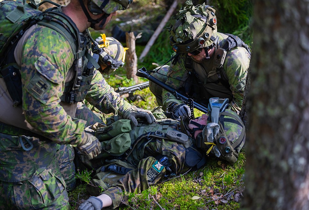 Harjoituksessa harjoiteltiin kaikille varusmiespalveluksen käyneelle tuttua tilannetta: taisteluensiapua. Kuva: Onni Isohella