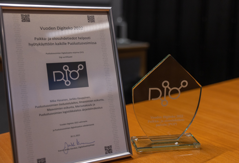 Puolustusvoimien henkilöstölle avointa paikka- ja olosuhdetietopalvelua (POP) suunniteltiin monta vuotta Puolustusvoimien sisäisenä yhteistyöprojektina. Vuoden Digiteko 2022 -palkinnon innovaation suunnittelijoille luovuttanut Puolustusvoimien digitalisaatiojohtaja, eversti Jarkko Karsikas kehuu palvelua kattavaksi.