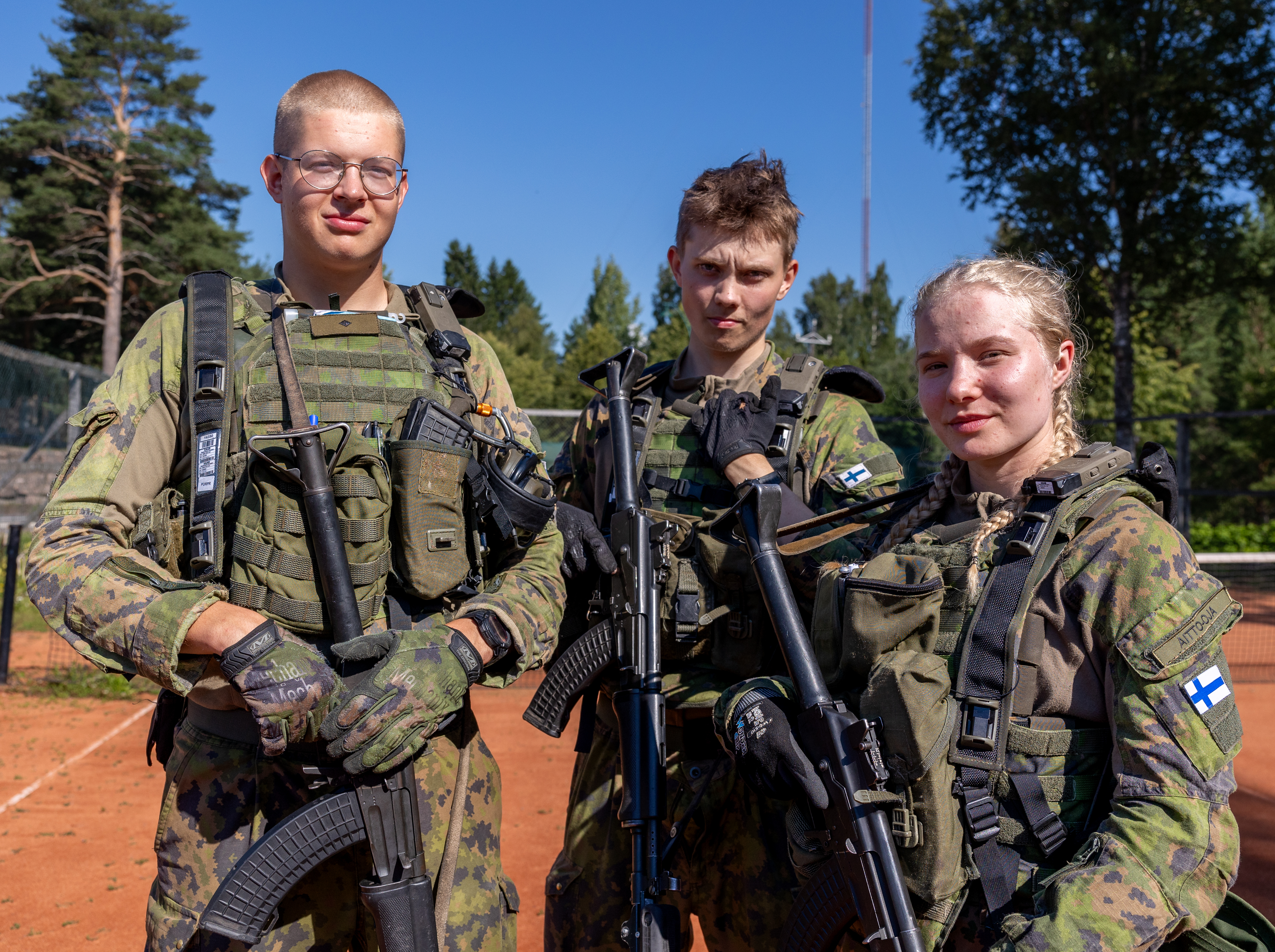 Tuomas Kuukalle, Aleksi Kurunsaarelle ja Anna Aitto-ojalle kyseessä on reserviupseerikurssin viimeinen harjoitus. Kuva: Elias Harinen
