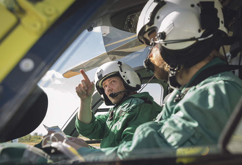 Kun tämä kaksimoottorinen Airbus H145 nousee ilmaan, kyydissä on aina nelihenkinen miehistö: koneen päällikkö, perämies, lentoavustaja ja ensihoitaja.