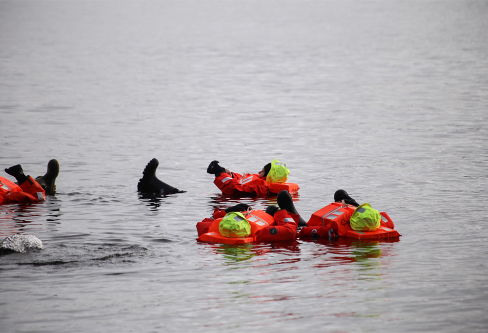 Turvallisesti vesillä -kurssilaisia harjoittelemassa pelastautumista.