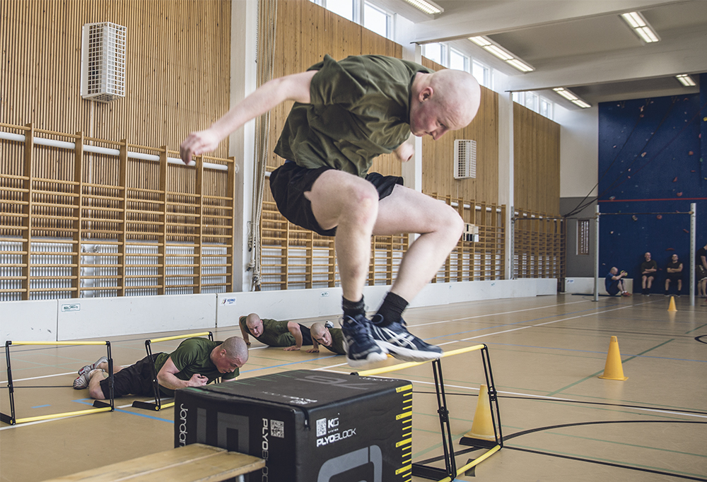 Lyhyen lämmittelyn jälkeen oppilaat tekevät kouluttajan johdolla yhtenäisessä tahdissa haaraperushyppyjä. Tämän jälkeen on vuorossa rata, joka sisältää muun muassa kiipeämistä, hyppyjä, ryömimistä sekä burpeita, jossa noustaa punnerrusasennosta seisomaan ja hypätään ilmaan. Omaa vuoroa odotetaan polvet 90 asteen kulmassa, selkä seinää vasten.
