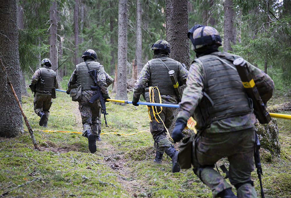 – Tänään on harjoiteltu sirotemiinoitteen kohtaamista. Kaupunkijääkärit ilmoittavat löytämästään miinoitteesta meille ja me raivaamme miinat pois putkiraivaajalla. Lopuksi merkitsemme nauhoilla raivatulle kaistaleelle johtavan "suppilon", jota pitkin jääkärit pääsevät turvallisesti miinoitteen läpi, kaupunkipioneerit taustoittavat.