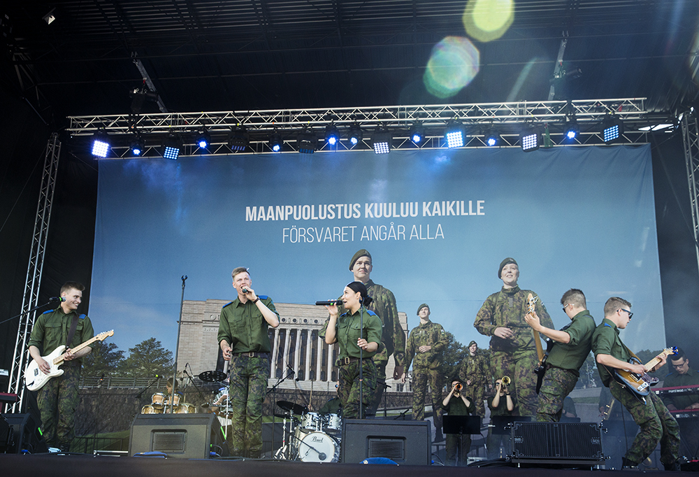 Puolustusvoimien varusmieskunnan Showbandin esiintyminenn Senaatintorilla oli osa Puolustusvoimat 100 -juhlaviikon ohjelmaa.
