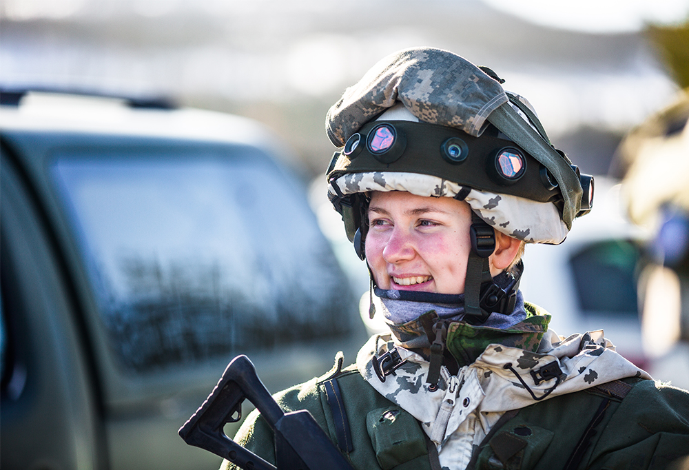Alikersantti Oona Seikkulalla oli varusteissaan simulaattoriteknologiaa.